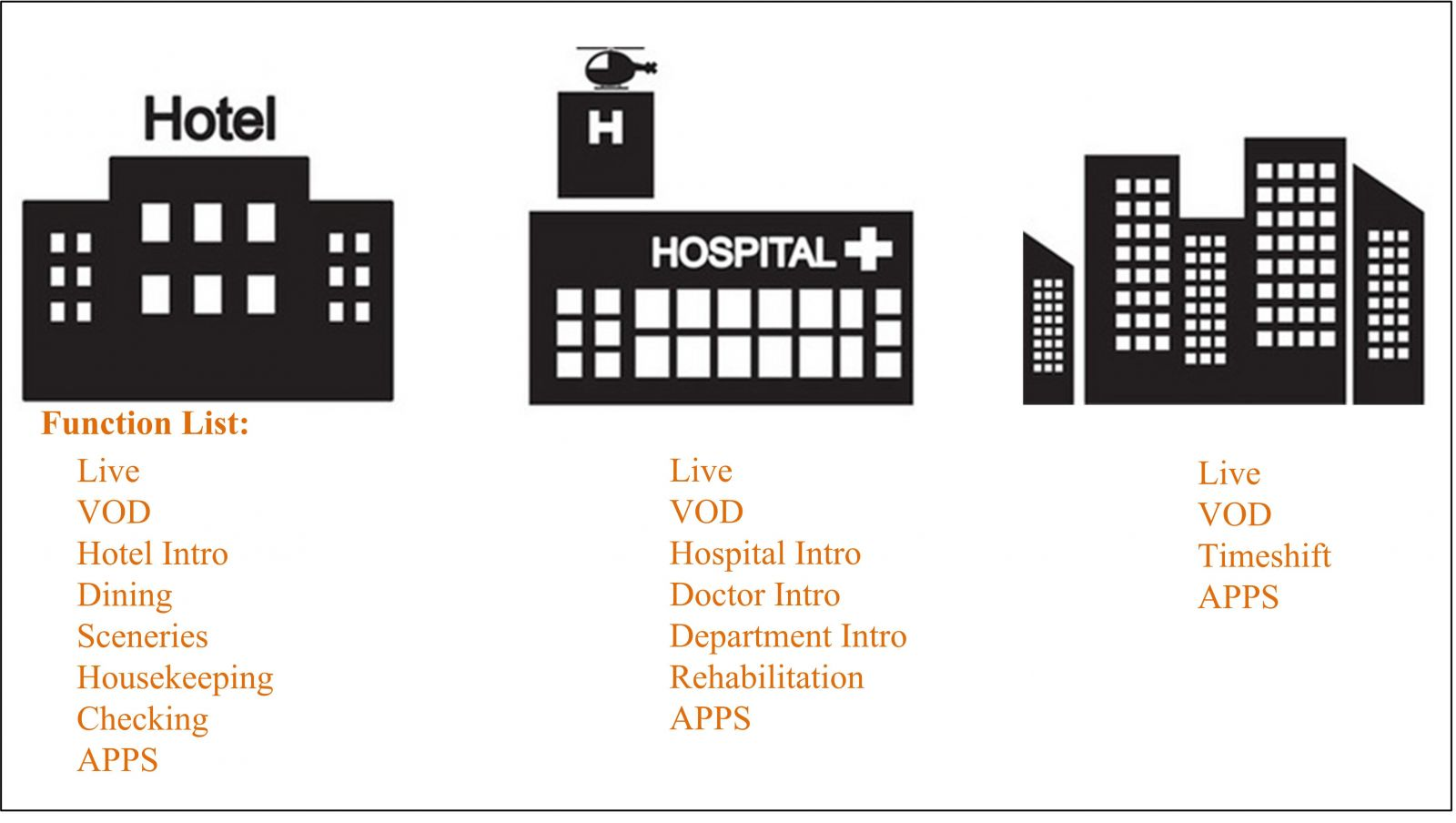 With the development of wide band and popularization of intellectualized service, digital TV service becomes diversified day by day with integrating live programs, entertainment, games, travel and business in one system. Hospitals, hotels and operators can only increase their brand visibility and customer satisfaction by providing more multimedia service and more enjoyable experience.