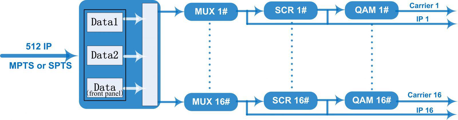 YDS3316 16 in 1 IP QAM modulator is the latest generational Mux-scrambling-modulating all-in-one device developed by Kunuomagic. It has 16 multiplexing channels, 16 scrambling channels and 16 QAM (DVB-C) modulating channels, and supports maximum 512 IP input through the 3 GE ports and 16 non-adjacent carriers (50MHz~960MHz) output through the RF output interface. The device is also characterized with high integrated level, high performance and low cost. This is very adaptable to newly generation CATV broadcasting system.